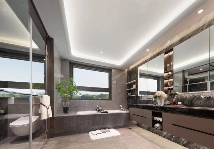 主卫配置了东西两侧双面岩板、唯宝智能壁挂马桶、双台盆,花洒龙头及五金均为高仪,淋浴房地面也是大理石铺设,还配备了彩妆冰箱。