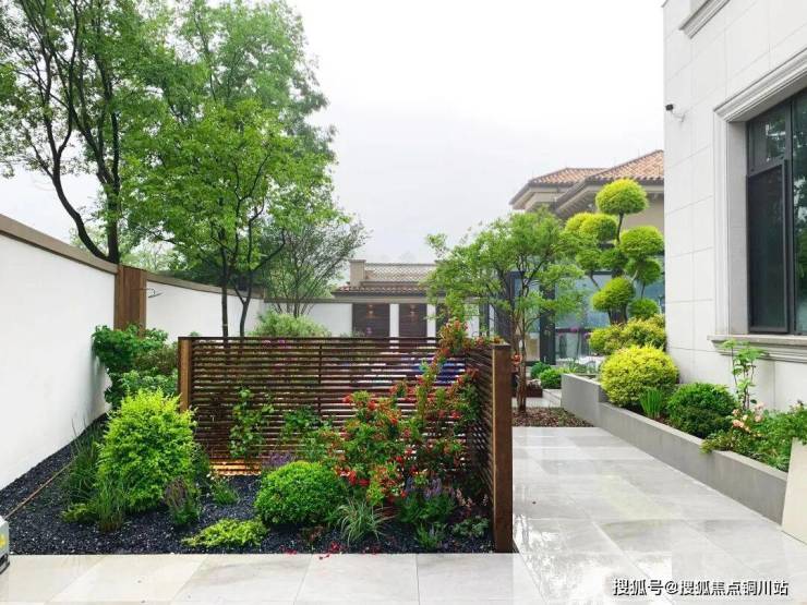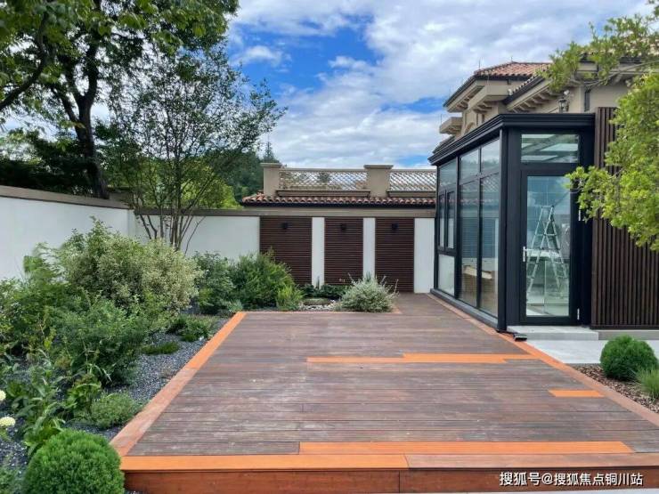 入户处通道采用较低矮的竹木栅栏作为背景,内部种植锦带花等植物。不光起到了装饰作用,同时遮挡了通往木平台视线,保护隐私。