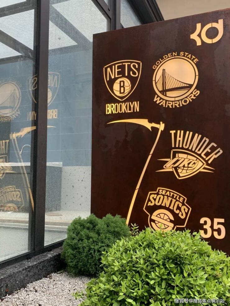 景墙由KD:杜兰特名字的缩写;四个队徽:杜兰特职业生涯中4个球队;以及35和镰刀形的7:杜兰特球衣号码组成。