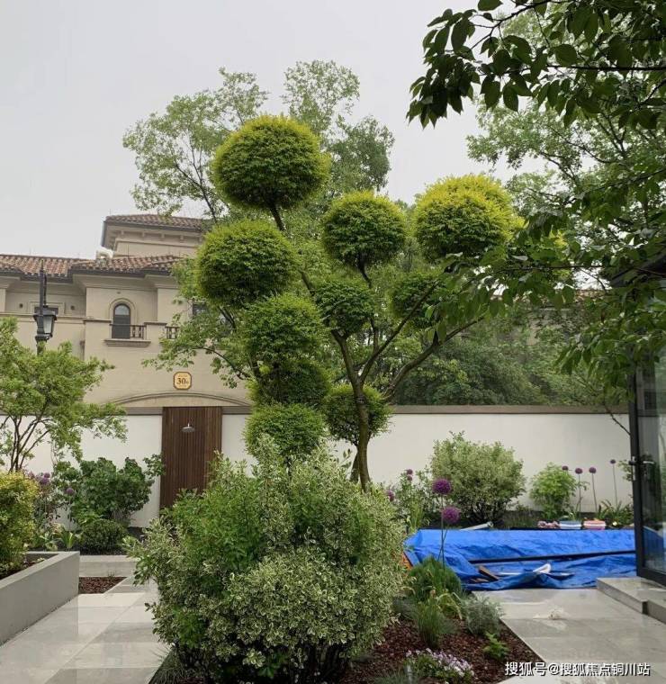 在通道两边分别孤植了两颗多头造型的树,作为点缀,同时示意道路的变化。