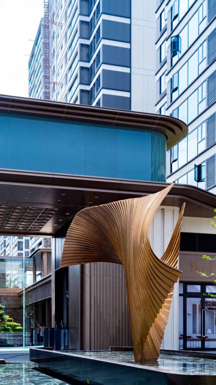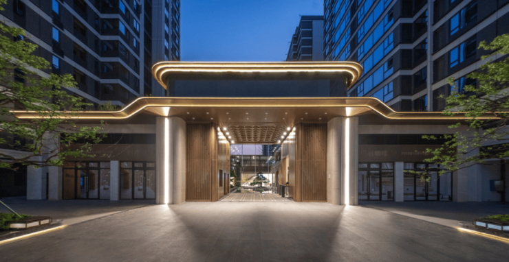 门庭、造景都是社区艺术性的对外展现。万境松雅对标五星级酒店审美,将现代感+文脉气质融合创新,在大门、庭院等重要节点上,采用大面玻璃幕墙及轻盈线条作外饰面,拾配石材、铝板、金属格栅的组合,使建筑成为风景的幕布,高格调立现。