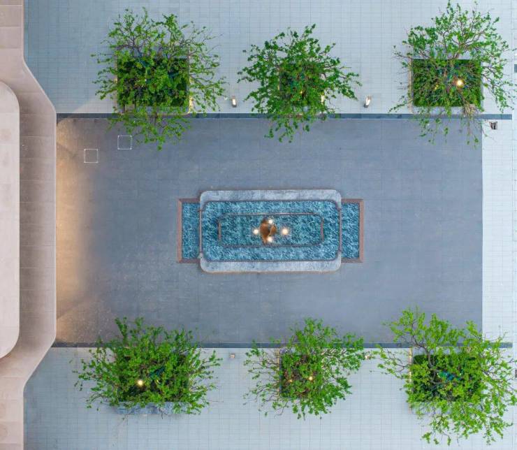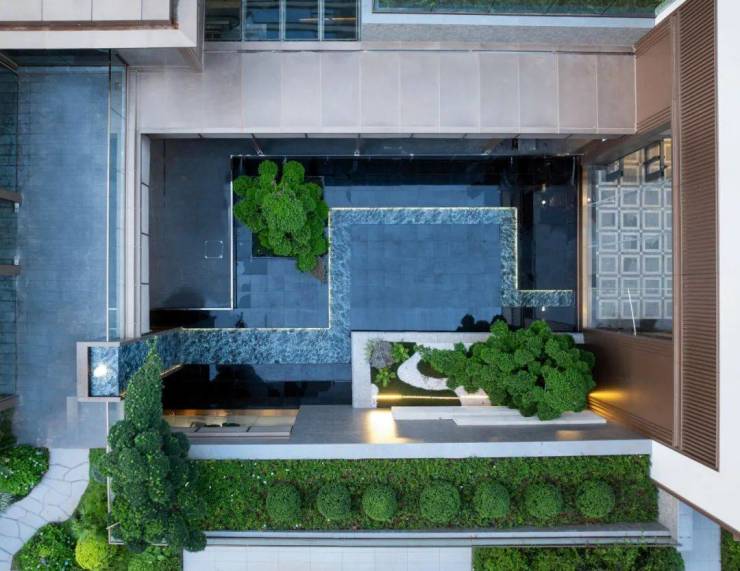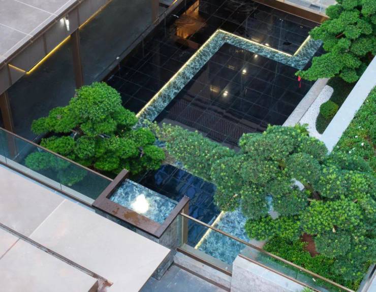 穿过酒店式门庭大堂,视线再度吸引,最惊艳的地方也来了——下沉式水景庭院,湖湘的灵秀山水与归家的奢雅气韵都在这里体现。众所周知,园林做水景成本高、维护不易,所以一般房企不会轻易做,而想把水景做好看,也很难。难在什么地方?