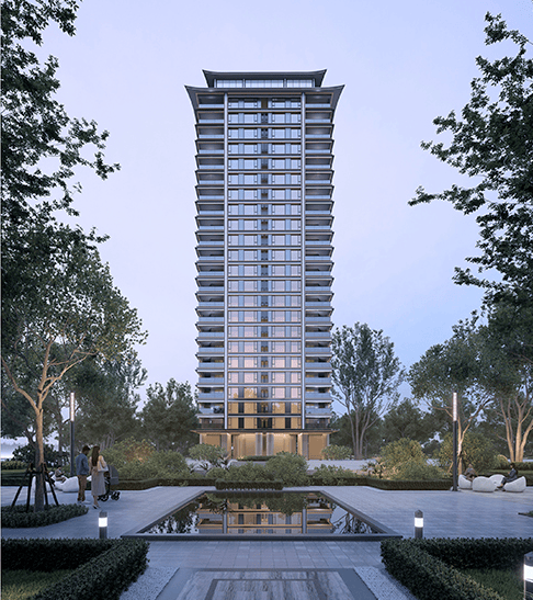从规划效果图来看,住宅楼栋的顶部做了类似飞檐造型,有可能打造为中式住宅。不过这对顶楼等相近楼层采光会有不利影响。