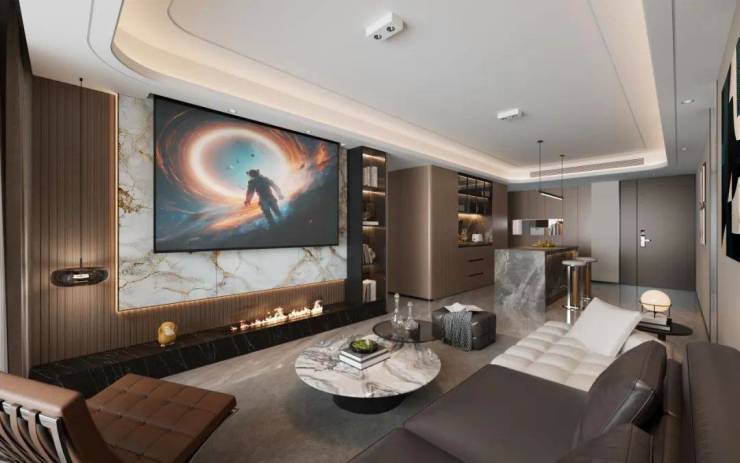 打造成私家影音室,静雅环境搭配巨幕、音响,不必在影院人潮中拥挤,亦可随时开启视听盛宴。闲暇时与爱人、亲友尽享欢聚,沉浸时光,温情满溢。