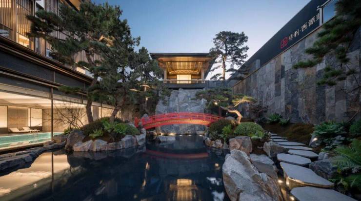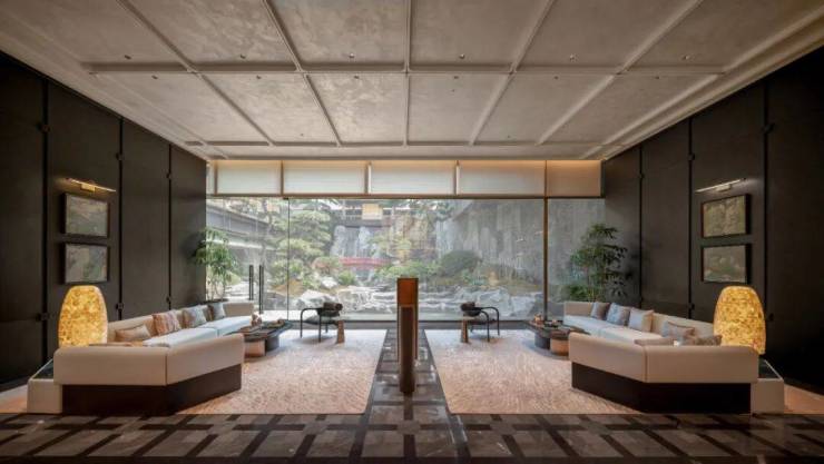 其中下沉庭院取意于“南宋四大家”之一刘松年的传世名画《四景山水图》,飞瀑跌水、林壑松风,亭台楼阁高居悬崖之巅,枕波桥横卧溪水之上,高山流水的造景,仿佛宋画复活了。
