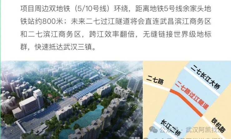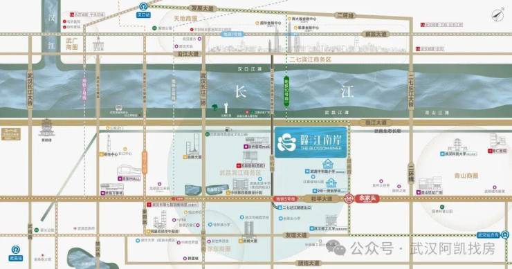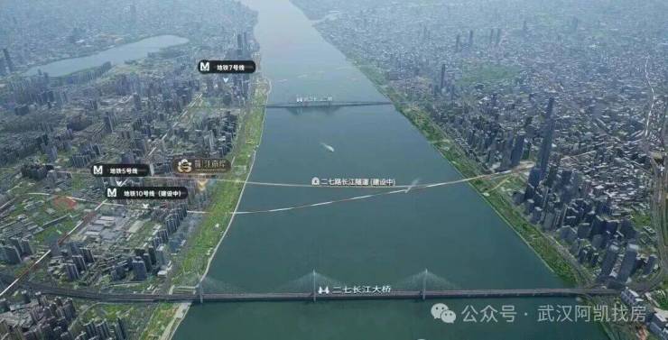 📍 地理位置优越:落子武昌滨江商务区杨园片,与二七滨江商务区隔江相望,长江对岸就是武汉陆家嘴三件套(国华金融中心、泰康金融中心、周大福金融中心)。二七路过江通道正从武汉城建·江南岸旁下穿,对岸出口在周大福金融中心附近,从地理位置和经济定位来看,这条过江隧道就是二七滨江的中轴线,也是连接二七滨江与武昌滨江的价值枢纽,如果修通预计十分钟内就到到周大福中心。