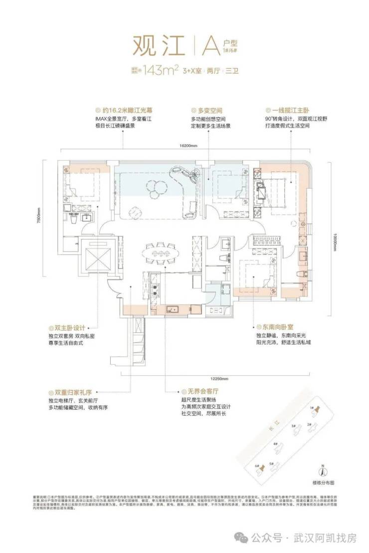 约16.2米IMAX级观江面,实现了客厅+次卧+双主卧四面观江,其中东主卧还做了弧形转角窗设计,能无遮挡270度双面观江。