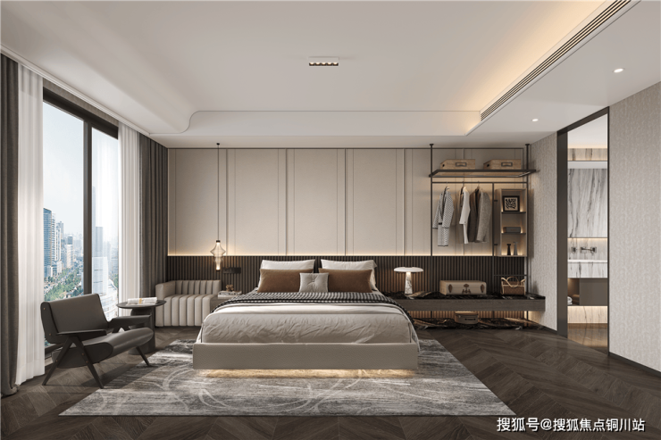 我们再来看恋人主卧套房,该房预留了书房和化妆台空间,独有睡前沙发交流区,这种尺度让甜蜜生活更具仪式感。