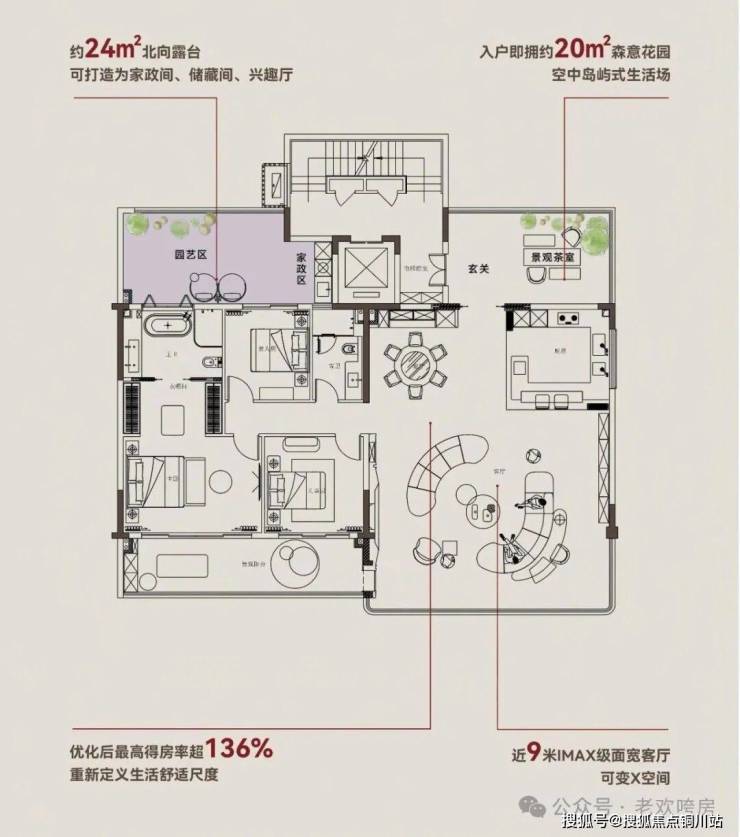 约20㎡入户空中花园、南向约17米跑道式阳台、北向约24㎡功能露台,得房率超136%!