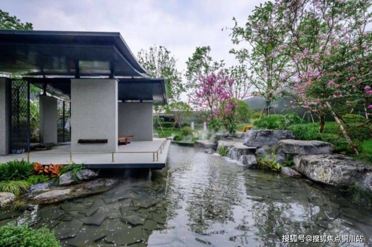 叠水与树林相映,黑山石错落其间,亭台轩榭凭栏观景,五境合一最终聚于臻园的院落