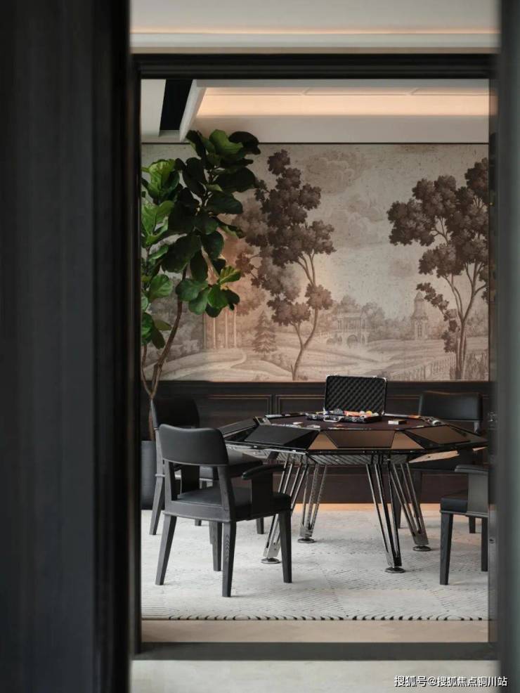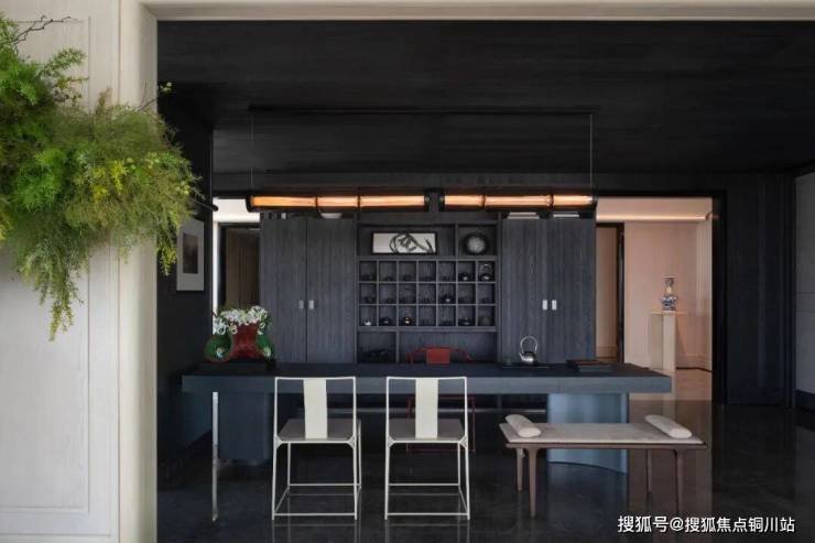 如果说临窗的观景客厅是明亮洋溢,那么与景观横向平行的茶室则是深沉内敛的,整体黑色暗纹木饰面,配一双竹节般吊灯,凸显禅意经典。