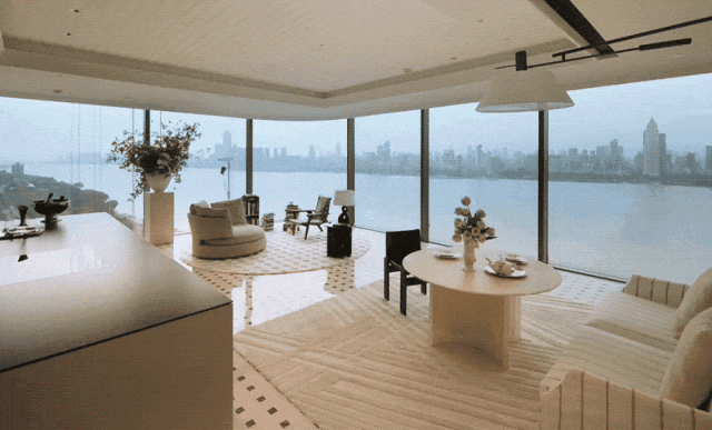 奢阔尺度之下,会客空间的米白色沙发套组围合出沉静松弛,面对每一个角度而设的“观景位”更把江景转化为流动的盛宴,让每一次落席,都坐拥无垠江景的C位。
