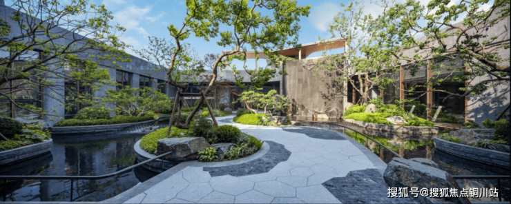 入口两侧大面水系环绕,水景池壁采用进口蓝钻石材;5棵名贵造型松,体态古朴层次清晰。