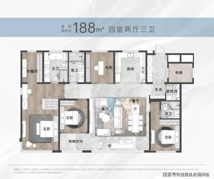 作为更大尺度的套四产品,约188㎡户型是137㎡的升级与拔高。188平的套四三卫,在客厅、卧室、阳台等提升了尺度感,舒适感。