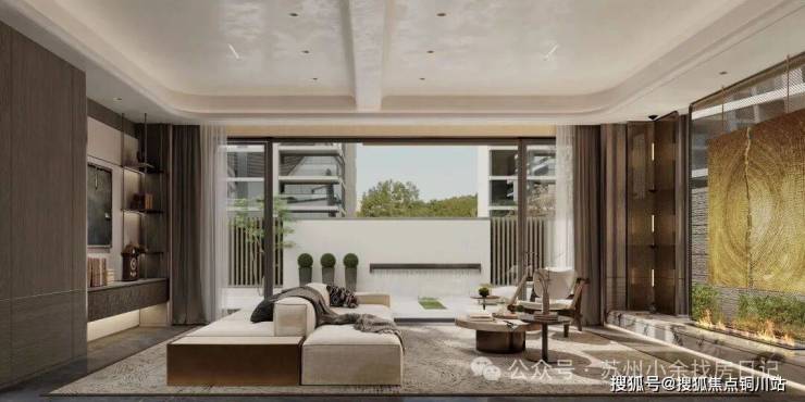 ③一心:中心高定典藏花园,沉香米黄石+蓝钻花岗岩流水面搭配透光云石,奢华氛围营造;花园廊亭将中心花园四季风景、潺潺流动的水景尽收眼底;