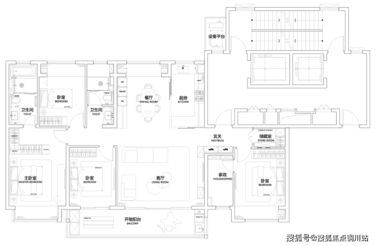 不可思议的是,朝南还设置单独的家政间,洗衣机、烘干机、洗护收纳都轻松安放。另一角度,也卸下了南阳台的家政功能,将风景与美学还给开放的公区。