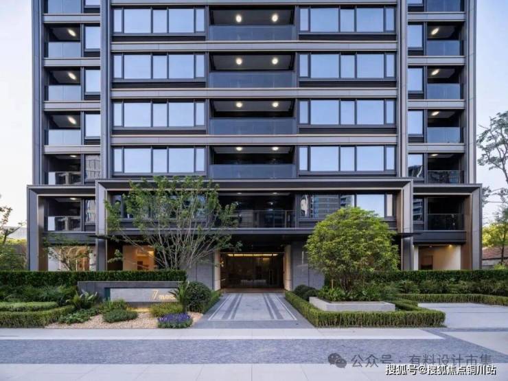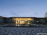 设计团队以“漂浮的无限山海”为灵感,将临海独特的山魂海韵与文人的雅致风骨,凝练于现代建筑与景观之中。主入口建筑立面选用沉稳的印度蓝石材与精致的暗金色金属型材,线条简洁流畅,于光影变幻间勾勒出“景雅大气”的现代风骨。