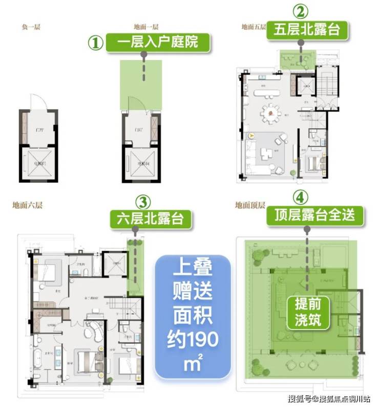 同时将庭院从地面解放,升维至空中,创造了前所未有的「四维花园体系」,近190㎡的极致赠送,打造院落平权化。