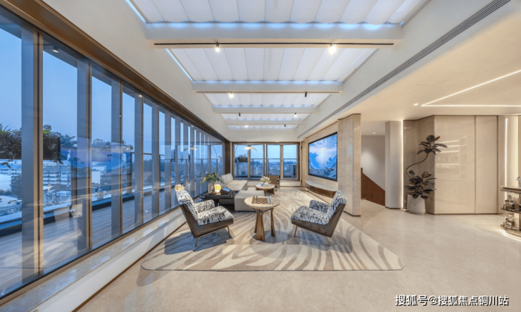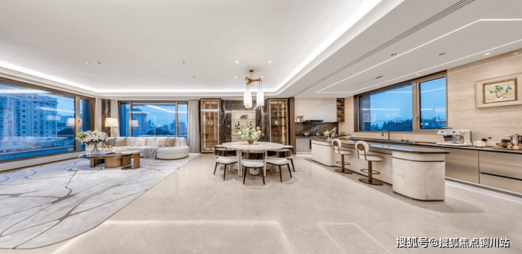南向与侧向的双面IMAX巨幕落地玻璃窗,北向厨房亦大面积窗景,最终实现了270°环幕三面观景的殿堂级体验。