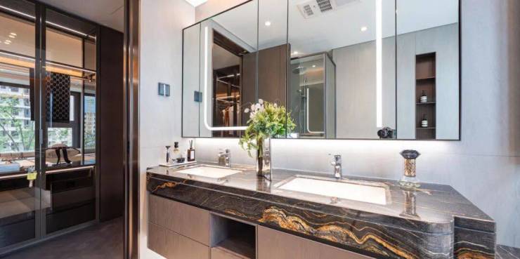 海信·璟悦以星级酒店规制打造双套房,主卧配备双台盆与观景浴缸,让日常也成为一场生活的仪式。