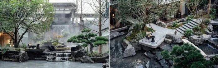 示范区的核心是一处下沉式水苑,设计团队通过“山、水、石、树”的堆叠,营造出丰富的空间高差。水苑中央,一块重达8吨的太湖石孤悬于水面,石上攀爬着常春藤与薜荔,水流从石缝间潺潺落下,形成“清泉石上流”的意境。岸边的流线型玻璃连廊将室内外空间无缝衔接,居民漫步其中,既能透过玻璃欣赏水苑景致,又能感受到自然风的穿堂而过,真正实现“建筑退让自然,景观渗透生活”。