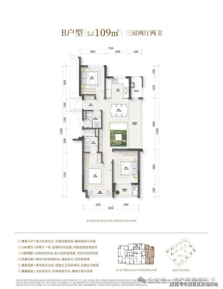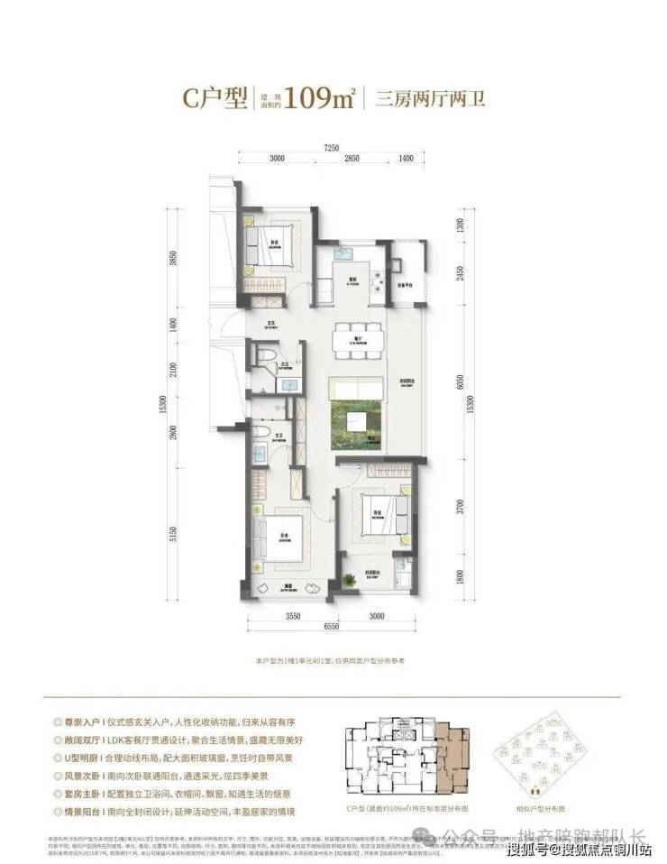 109平米户型:尊享三室两厅双卫设计,配备独立玄关,宽敞横厅边套,功能分区明确。配备生活阳台与休闲阳台(全包),实现13米超长采光,打造舒适明亮的生活空间。