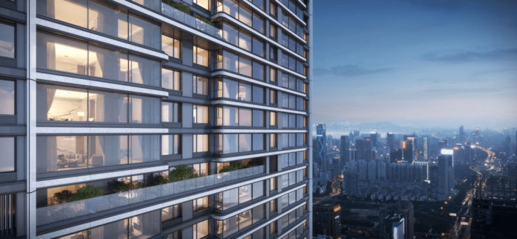 此外,外立面上采用大面积LOW-E玻璃融入双重“高级灰”,同时选用单扇超2m的宽幅玻璃统一封装阳台,打造出极具现代感和差异化的公建化外立面,极具辨识度。