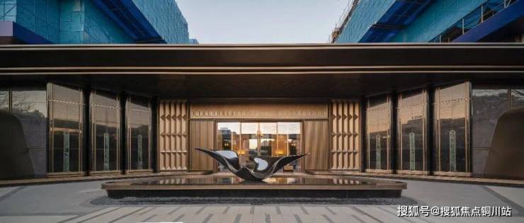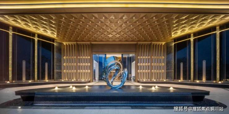 项目主入口打造约70米恢弘鎏金门庭,搭配奢石景墙+迎宾水景+艺术雕塑,排面十足。