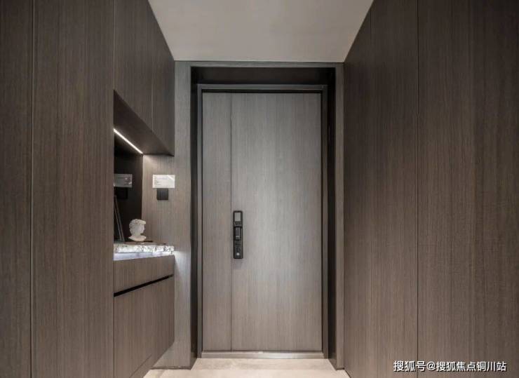入户门选用重达约400斤,厚度约10cm 的重奢铸铝工艺门扇,经百余次打磨,形成独特的纹理质感,配以线条简洁的飞利浦入户门锁,让门变成“艺术品”。