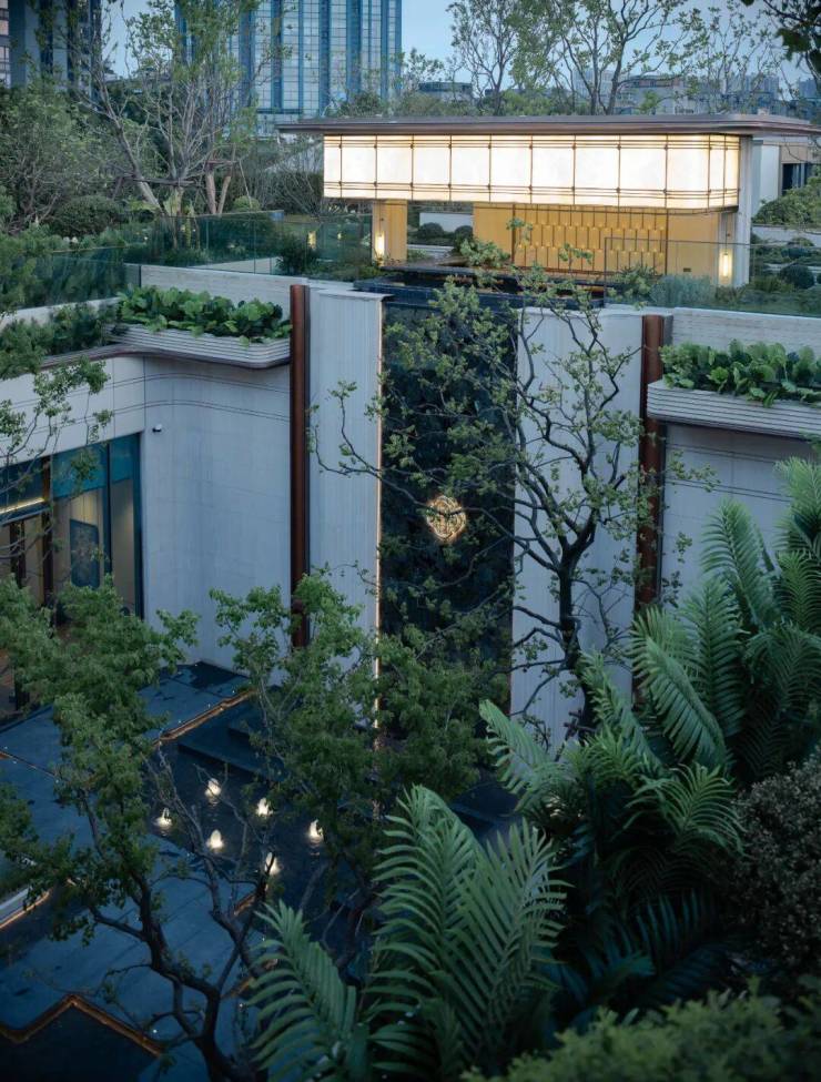 下沉式庭院中,蓝翡翠奢石流水墙光影灵动;三棵约9米高的 “乌桕王”,树冠层叠,与海派美学诗意对话。