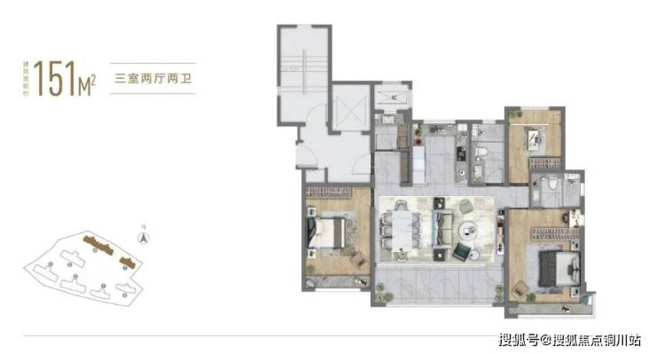 建面约151㎡湖景小高层的标准层,是奢装的阔绰三居。