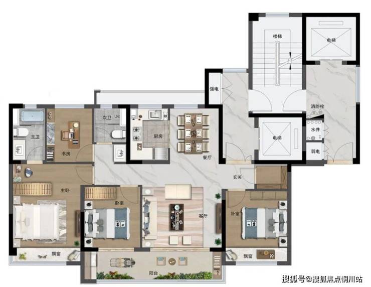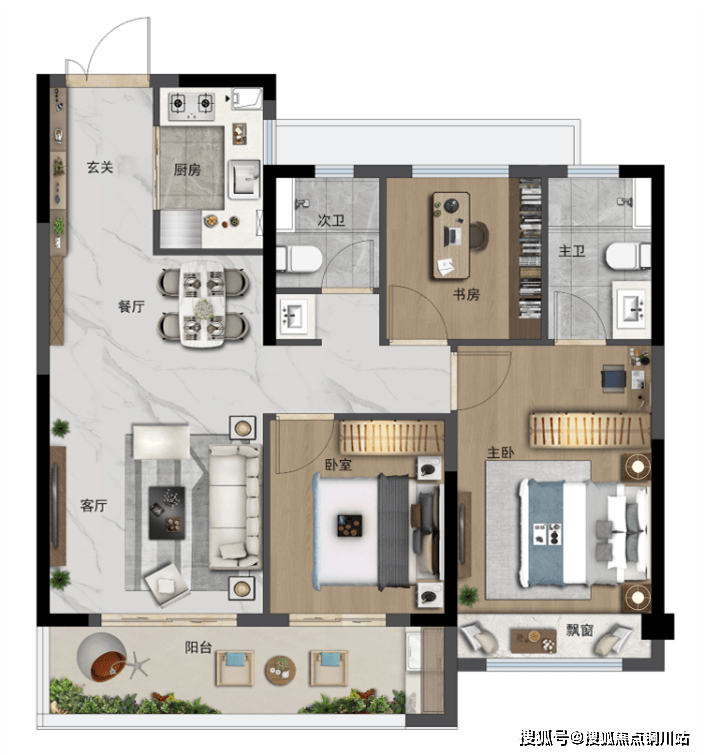 更绝的是,除了主卧套房配独卫、衣帽间、飘窗外,东侧的次卧也做了观景飘窗设计。