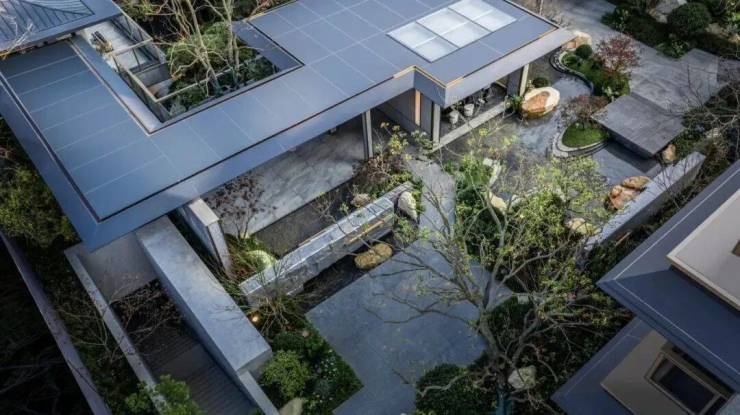 合院、叠墅项目采用金属、大理石、香槟色金属线条、石材幕墙等多材质颜色搭配,结合玻璃、金属挂落、栏杆等纤细构件的应用,让项目立面既轻盈典雅,又充满现代设计独有的简约大气。