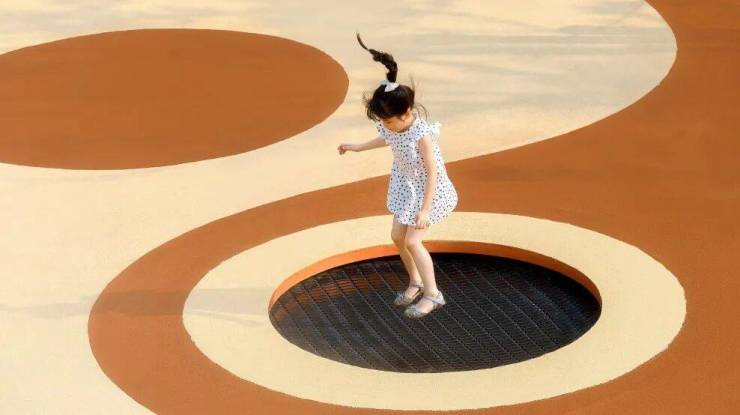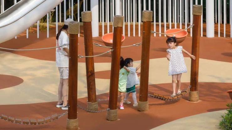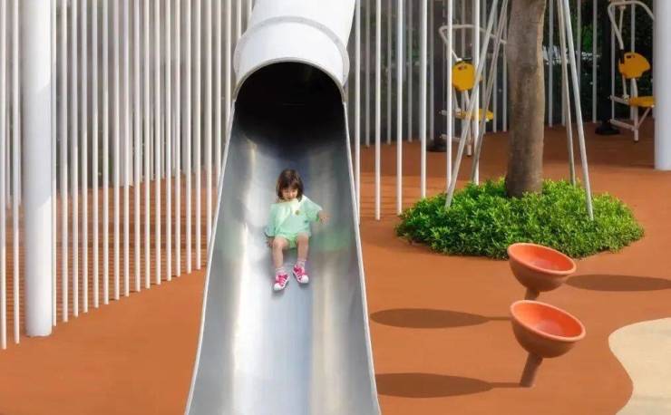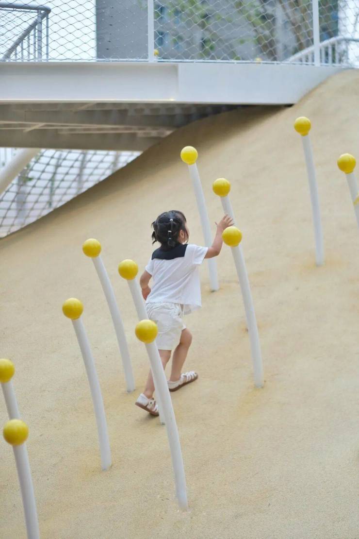 两侧的攀岩坡道,能够锻炼孩子们的勇气。成长就是不断攀爬向上的过程,累了停下歇歇也没关系,半路的风景也不错。