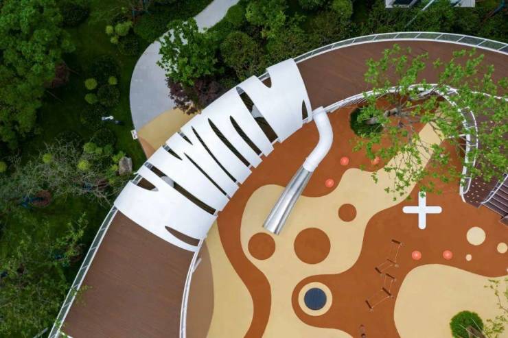 利用攀爬、滑梯等多种游乐方式串联上下两层空间,将覆盖全龄的活动功能巧妙的融合到云环中,形成一个与自然相互交融的综合活动空间。