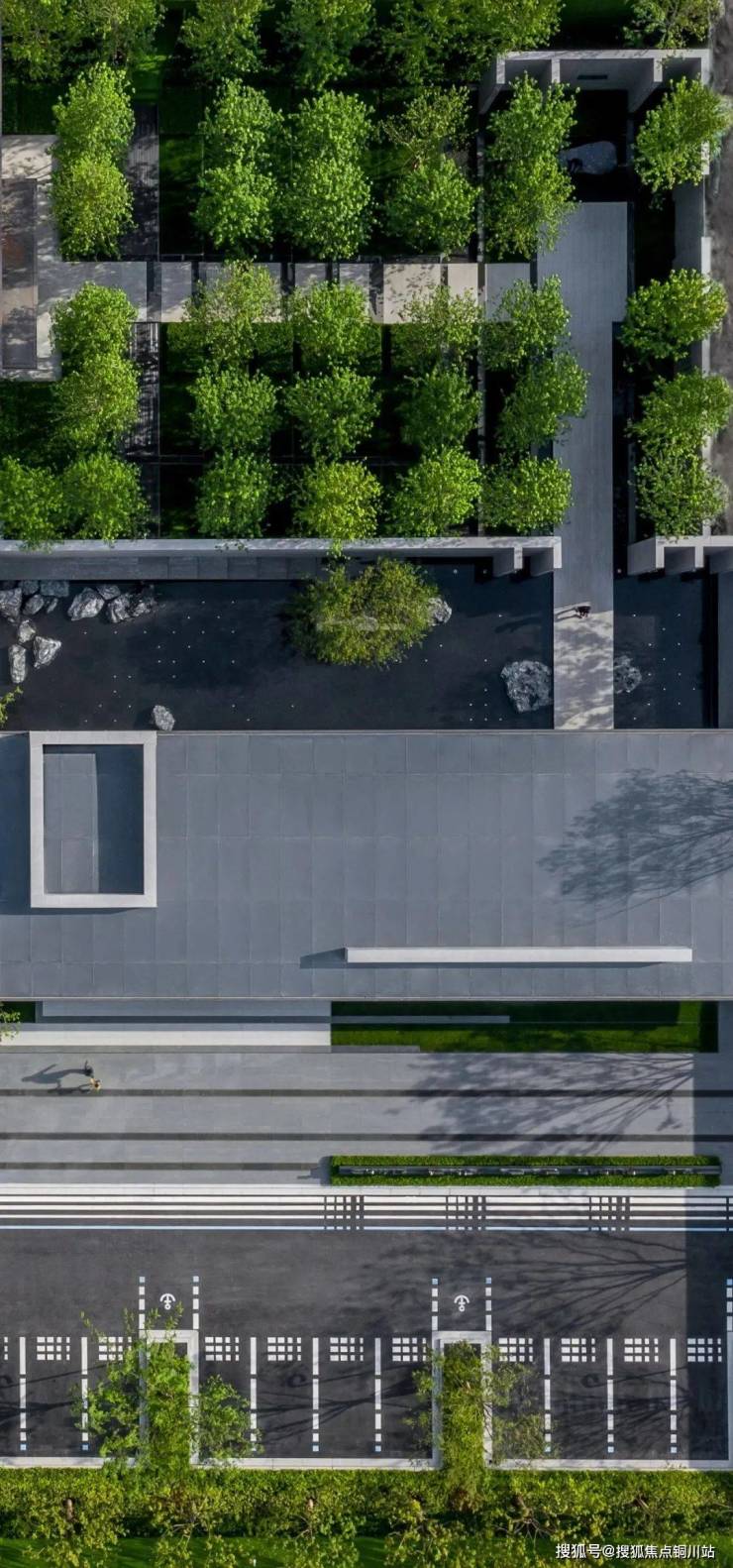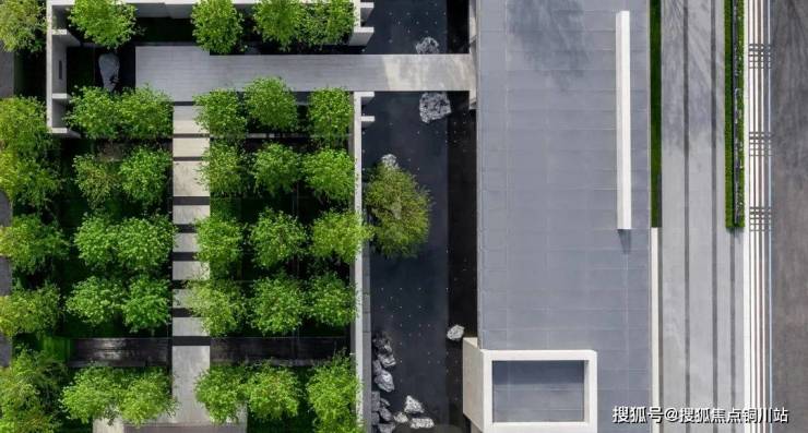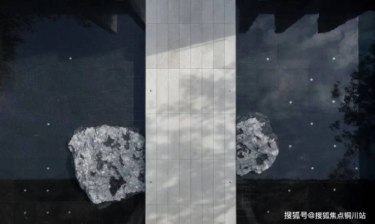 景石点缀水院,有的搭配树木成为了小岛,有的涌出水流成为了源头,有的被小路切割一分为二,坚硬的黑石尝试让水院生动活泼起来,融进了一抹自然。