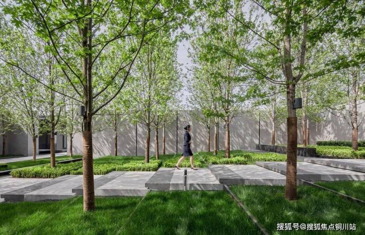 枫林台地是一处与前庭水院截然不同的绿境空间,精选36株美国红枫,逐级而上排开,力挺整齐。当阳光洒下,可在长凳之上享受林影,秋季红叶时,会遇见满林红叶的季相。