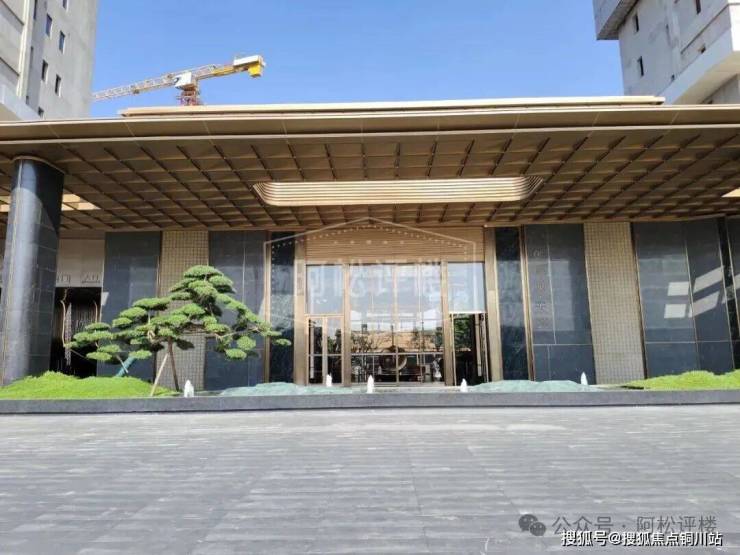 项目正大门,不仅有水景、迎客松,还有大理石搭配金属线条,非常大气。