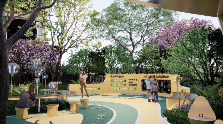 浮光水院:景观通过高差的营造,形成丰富的立体自然花园。水系勾勒空间,从会客厅的下沿缓缓流出,在乌桕林间穿梭,营造蝉鸣幽静的自然意境,以“自然共生·社交无界”为核心理念,重新定义社区交流场景。