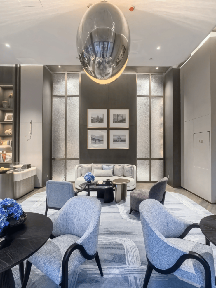 墙面艺术:石材与内嵌金属铜条增加细节和奢华感。天花水晶灯与灯光效果结合如波光粼粼的江水水滴。空间弧形造型及线条如行云流水般舒畅,体现空间高山流水的设计主题。