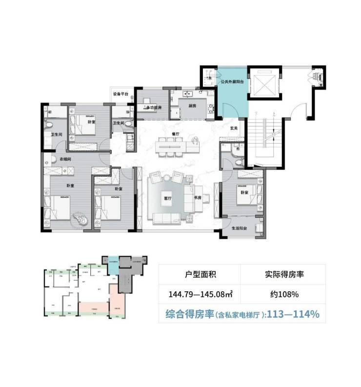 约114%综合得房率丨洋房标准层约108%得房率,综合得房率(含电梯厅)高达114%,兑现真正的低密奢阔空间。