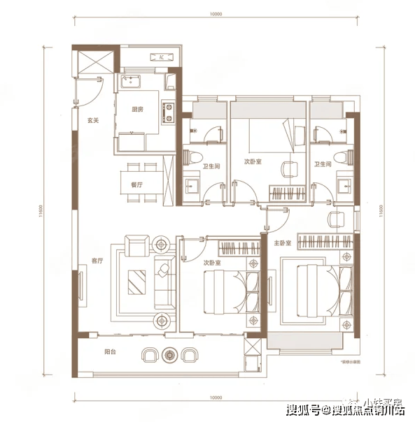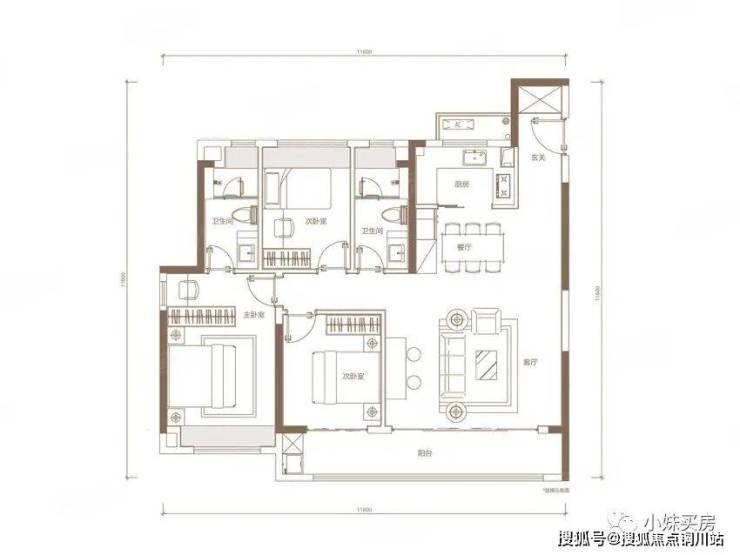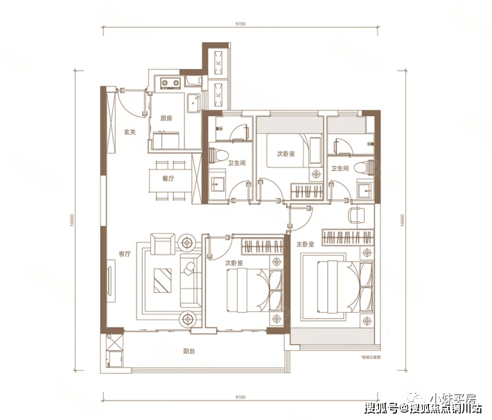 户型方正,南向面宽9.7米,双联大阳台。全屋三飘窗设计,主卧套房带大飘窗,独立卫生间和衣帽间。