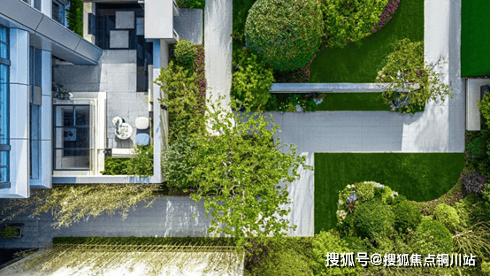 入户门庭围绕着郁郁葱葱的繁花与绿植,织成生机盎然的绿色锦缎铺展出一条繁茂的道路。从高空望去,景观组团如绽放的花朵,让整个园林焕发出别样的姿彩。