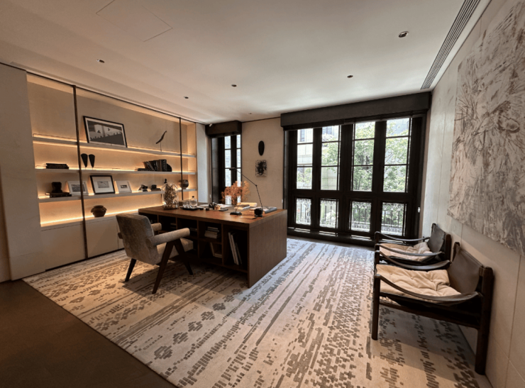 整体一层空间的东南方向,样板间设计为了茶室,配合西向落地玻璃窗,同样正对庭院。