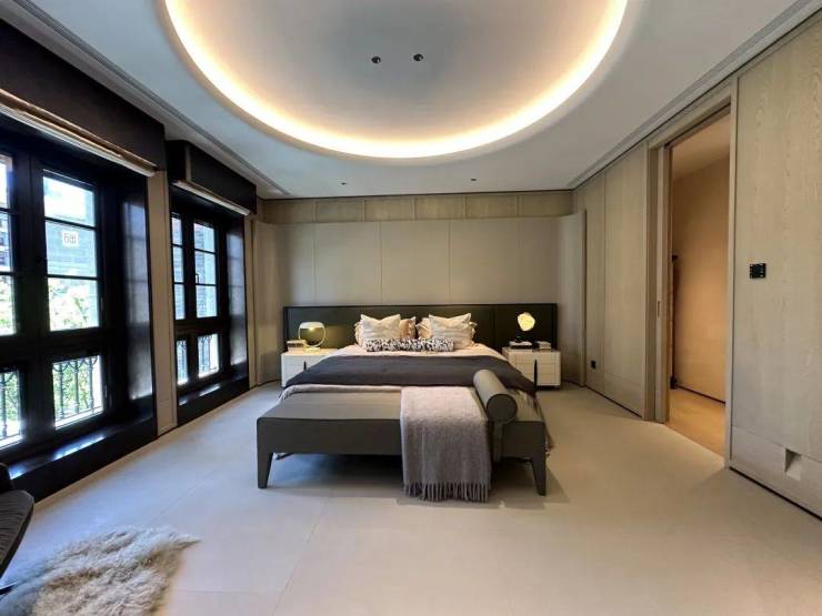 三楼整层为主卧套房,样板间设计了双开门入卧室,进入起居空间,样板间选择在这里放一些艺术装饰、设计吧台来彰显主人品味。
