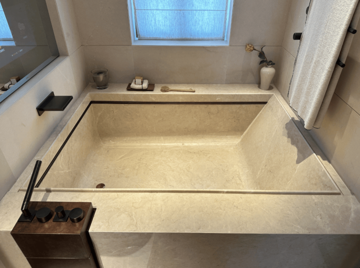 而样板间里这第二个卫浴空间,更接近于享受级。嵌入式浴缸,设计了魔镜系统,可以供业主泡澡时观影娱乐;除此之外,这个卫生间也有独立的淋浴房,并设计有桑拿房。