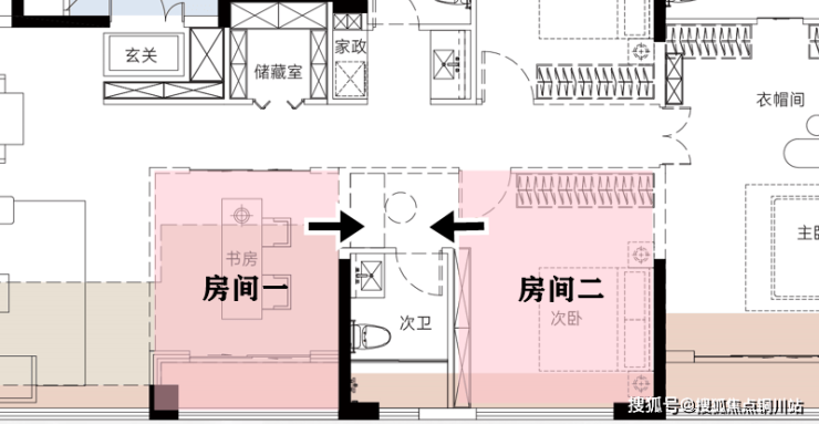 多功能房与南向次卧形成双卧夹一卫的格局,将两套房通过玻璃移门与卫生间分别打通,可形成一个相对独立的双胞胎套房,或是二胎套房。