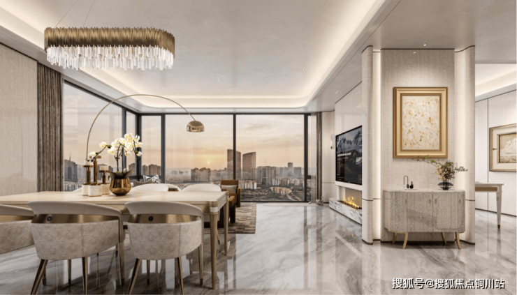 端头单元在客厅做了270°的转角玻璃窗,形成双面采光,而且这个窗还延伸到了餐厅,从餐厅到多功能厅的总采光面可达到约15米(不包含墙柱)。