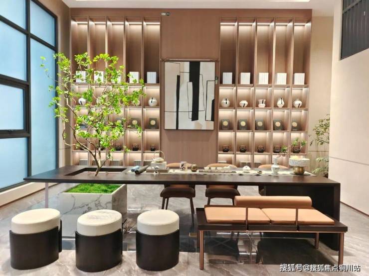 与入户大堂相连的空间,项目打造成了功能齐全的架空层,包含健身房、阅读空间、会客空间、茶室等。