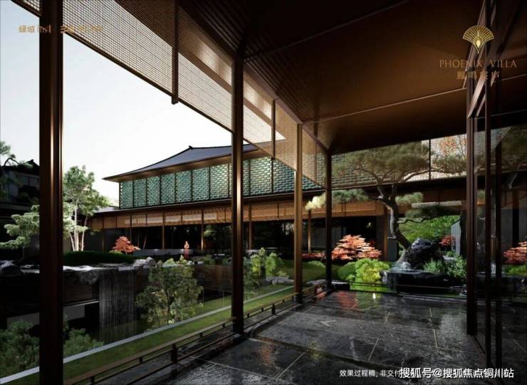 凤鸣宸庐建筑立面设计,正是对宋代风雅的现代转译。歇山顶的意象、寻杖勾栏的线条,被巧妙提炼、现代化演绎;西侧东方院落更匠心独具,以台州罕有的开合式金镂格栅,于光影流转间,复现宋画的静谧与灵动。